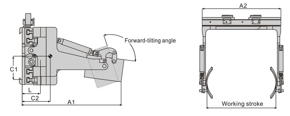 | Model | Carrying Capacity | Frame dimension | Forward-tilting angle | Opening range | Installation Grade | Self-weight | Load Loss Distance | Horizontal Center of Gravity | Verticla Center Gravity |