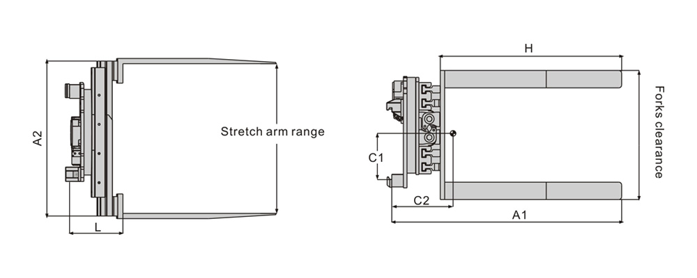 | Model | Carrying Capacity | Frame dimension | Length of fork | Opening range | Installation Grade | Self-weight | Load Loss Distance | Horizontal Center of Gravity | Verticla Center Gravity |